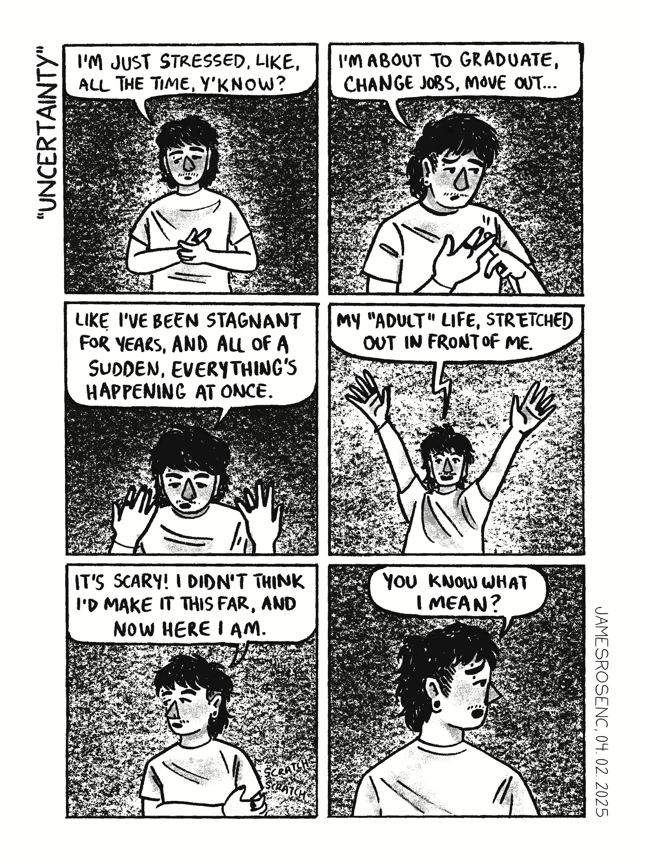 I proposed a concept for the edition’s theme of “reality” to reflect the common and crushing weight of existential dread with living in the world. I kind of low-balled myself, only offering two pages. I doubted my ability to express how I felt about the world at large and my own problems, but it turns out I’m a yapper and had a lot to say on the matter. I ended up focusing on my fears about coming into my own, becoming an adult, or whatever that means.